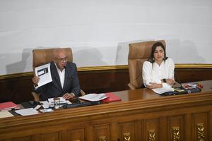 (251202) -- CARACAS, 2 diciembre, 2025 (Xinhua) -- El presidente de la Asamblea Nacional (AN) de Venezuela, Jorge Rodríguez (i), habla durante una sesión extraordinaria de la AN, en el Palacio Federal Legislativo, en Caracas, Venezuela, el 2 de diciembre de 2025. La AN de Venezuela repudió el martes, por unanimidad, el despojo de la petrolera venezolana CITGO y criticó a sectores de la oposición, tras la decisión de la justicia estadounidense de vender la empresa. (Xinhua/Marcos Salgado) (ms) (jg) (ra) (ce)