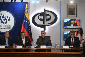 (260106) -- CARACAS, 6 enero, 2026 (Xinhua) -- El fiscal general venezolano, Tarek William Saab (2-d), participa durante una conferencia de prensa, en Caracas, Venezuela, el 6 de enero de 2026. Saab anunció el martes que investigarán los casos de las "decenas" de personas que murieron durante los ataques ejecutados por Estados Unidos contra Venezuela, el pasado 3 de enero. (Xinhua/Marcos Salgado) (ms) (jg) (ra) (vf)