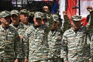 (251004) -- CARACAS, 4 octubre, 2025 (Xinhua) -- El ministro de Defensa venezolano, Vladimir Padrino López (c-frente), levanta el puño durante los ejercicios militares especiales de la estructura profesional de la Fuerza Armada Nacional Bolivariana (FANB), en la plaza Bolívar, en Caracas, Venezuela, el 4 de octubre de 2025. Padrino López supervisó el sábado los ejercicios militares especiales de la estructura profesional de la FANB para garantizar la paz ante una posible agresión. (Xinhua/Marcos Salgado) (ms) (jg) (rtg) (ce)
