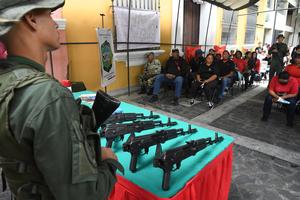 (250920) -- CARACAS, 20 septiembre, 2025 (Xinhua) -- Personas observan fusiles durante una clase de adiestramiento militar como parte de un ejercicio llevado a cabo en una plaza, en Caracas, Venezuela, el 20 de septiembre de 2025. Las fuerzas militares venezolanas desarrollan desde la mañana del sábado en todo el país, los ejercicios denominados "Los Cuarteles van al Pueblo", que forman parte de las operaciones de preparación en defensa de Venezuela. (Xinhua/Marcos Salgado) (ms) (jg) (rtg) (ce)