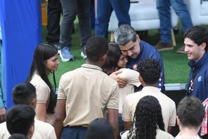 (251121) -- CARACAS, 21 noviembre, 2025 (Xinhua) -- El presidente venezolano, Nicolás Maduro (2-d-atrás), abraza a una estudiante durante un acto por el Día del Estudiante Venezolano, en Caracas, Venezuela, el 21 de noviembre de 2025. Los estudiantes venezolanos se movilizaron el viernes en Caracas para celebrar su día y en defensa de la paz y la educación. (Xinhua/Marcos Salgado) (ms) (rtg) (ra) (ce)