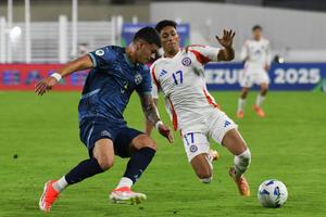 (250208) — CARACAS, 8 febrero, 2025 (Xinhua) — Imagen del 7 de febrero de 2025 del jugador Axel Balbuena (i), de Paraguay, disputando el balón con Emiliano Ramos (d), de Chile, durante el partido correspondiente a la segunda fecha de la fase final del torneo Sudamericano Sub-20 de la Confederación Sudamericana de Fútbol (Conmebol), celebrado en el Estadio Olímpico Nacional Brígido Iriarte, en Caracas, Venezuela. (Xinhua/Marcos Salgado) (ms) (oa) (da)