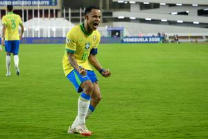 (250205) -- CARACAS, 5 febrero, 2025 (Xinhua) -- Imagen del 4 de febrero de 2025 del jugador Pedro Henrique Silva, de Brasil, festejando su anotación durante el partido correspondiente a la primera fecha de la fase final del torneo Sudamericano Sub-20 de la Confederación Sudamericana de Fútbol (Conmebol) ante Uruguay, celebrado en el Estadio Olímpico Nacional Brígido Iriarte, en Caracas, Venezuela. (Xinhua/Marcos Salgado) (ms) (ah) (ra) (vf)
