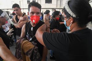 (250502) -- LA GUAIRA, 2 mayo, 2025 (Xinhua) -- Un migrante venezolano repatriado desde Estados Unidos recibe una vacuna después de llegar al Aeropuerto Internacional Simón Bolívar, en Maiquetía, estado de La Guaira, Venezuela, el 2 de mayo de 2025. Otros 183 repatriados venezolanos llegaron la tarde del viernes a la nación suramericana procedentes de Honduras, señaló el ministro de Interior, Justicia y Paz, Diosdado Cabello, quien recibió el vuelo número 18 con migrantes. (Xinhua/Marcos Salgado) (ms) (rtg) (ra) (ce)