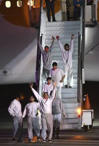 (250220) -- LA GUAIRA, 20 febrero, 2024 (Xinhua) -- Ciudadanos venezolanos deportados de Estados Unidos festejan mientras descienden de un avión a su llegada al Aeropuerto Internacional Simón Bolívar, en Maiquetía, estado de La Guaira, Venezuela, el 20 de febrero de 2025. El ministro de Interior, Justicia y Paz de Venezuela, Diosdado Cabello, anunció la noche del jueves la llegada al país de 177 ciudadanos venezolanos deportados por el Gobierno de Estados Unidos y repatriados por las autoridades venezolanas, en el marco de un acuerdo bilateral. El Gobierno de Honduras, en cooperación con Estados Unidos y Venezuela, realizó acciones humanitarias para facilitar el traslado de los migrantes desde territorio estadounidense hacia el país sudamericano. Venezuela expresó su agradecimiento a la presidenta hondureña, Xiomara Castro, y al expresidente Manuel Zelaya "por toda la colaboración prestada para el rescate de estos compatriotas". (Xinhua/Marcos Salgado) (ms) (vf)(Xinhua/Marcos Salgado) (ms) (vf) (ce)