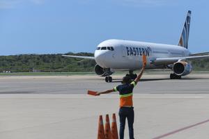 (250330) -- LA GUAIRA, 30 marzo, 2025 (Xinhua) -- Un avión estadounidense con migrantes venezolanos deportados desde Estados Unidos a bordo aterriza en el Aeropuerto Internacional Simón Bolívar, en Maiquetía, estado de La Guaira, Venezuela, el 30 de marzo de 2025. Otros 175 migrantes venezolanos deportados llegaron la tarde del domingo a Venezuela procedentes de Estados Unidos, informó el ministro para Relaciones Interiores, Justicia y Paz, capitán Diosdado Cabello. (Xinhua/Marcos Salgado) (ms) (rtg) (da)