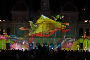 (250430) -- HANOI, 30 abril, 2025 (Xinhua) -- Imagen del 29 de abril de 2025 de un espectáculo de luces llevado a cabo en el Ayuntamiento, en la Ciudad Ho Chi Minh, Vietnam. Vietnam se encuentra en la etapa final de los preparativos para una gran ceremonia conmemorativa del 50 aniversario de la Liberación del Sur y la Reunificación Nacional, que tendrá lugar el miércoles, informaron medios locales. (Xinhua/Hu Jiali) (ah) (ra) (vf)