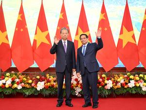 (250902) -- HANOI, 2 septiembre, 2025 (Xinhua) -- Zhao Leji, miembro del Comité Permanente del Buró Político del Comité Central del Partido Comunista de China (PCCh) y presidente del Comité Permanente de la Asamblea Popular Nacional (APN), se reúne con el primer ministro vietnamita, Pham Minh Chinh, en Hanoi, Vietnam, el 2 de septiembre de 2025. Por invitación del Comité Central del Partido Comunista de Vietnam (PCV) y del presidente de la Asamblea Nacional, Tran Thanh Man, Zhao encabezó una delegación del Partido y del Gobierno para una visita a Vietnam, durante la cual también se reunió por separado con el secretario general del Comité Central del PCV, To Lam, el presidente vietnamita, Luong Cuong, y el primer ministro, Pham Minh Chinh, sostuvo conversaciones con Tran Thanh Man y asistió a los eventos para conmemorar el 80º aniversario de la Revolución de Agosto y el Día Nacional de la República Socialista de Vietnam de domingo a martes. (Xinhua/Li Xiang) (jg) (ra) (ce)