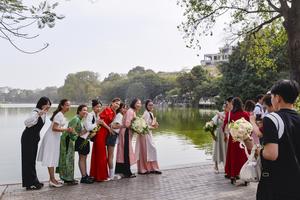 (250414) -- HANOI, 14 abril, 2025 (Xinhua) -- Imagen del 13 de abril de 2025 de turistas posando para una fotografía grupal, en el lago Hoan Kiem, en Hanoi, Vietnam. La capital vietnamita de Hanoi, una ciudad antigua con una historia de más de mil años, cuenta con una cultura diversa y sitios históricos. (Xinhua/Xu Qin) (oa) (ah) (vf)