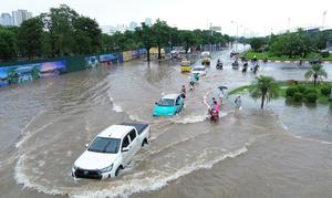 (251008) -- HANOI, 8 octubre, 2025 (Xinhua) -- Imagen del 7 de octubre de 2025 de vehículos circulando a través de calles inundadas, en Hanoi, Vietnam. Las fuertes lluvias e inundaciones provocadas por el tifón Matmo han dejado ocho muertos y cinco heridos en Vietnam, anunció el miércoles la Autoridad de Gestión de Desastres y Diques de Vietnam. (Xinhua/VNA) (jg) (da) (vf)