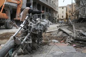 (250926) — SANA, 26 septiembre, 2025 (Xinhua) — Un hombre camina junto a una motocicleta dañada en ataques aéreos israelíes, en Saná, Yemen, el 26 de septiembre de 2025. (Xinhua/Mohammed Mohammed) (jg) (rtg) (vf)