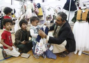 (250328) -- SANA, 28 marzo, 2025 (Xinhua) -- Imagen del 19 de marzo de 2025 de un padre midiendo un vestido para su hija durante una iniciativa caritativa previa al Eid al-Fitr, en Saná, Yemen. Mientras continúan los ataques aéreos estadounidenses en todo Yemen, incluida la densamente poblada capital, Saná, una iniciativa local ha ofrecido un fugaz momento de consuelo a los residentes de la ciudad que soportan casi una década de guerra. (Xinhua/Mohammed Mohammed) (oa) (ra) (vf)