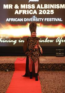 (250702) -- HARARE, 2 julio, 2025 (Xinhua) -- Imagen del 28 de junio de 2025 de una concursante presentando su atuendo en el concurso inaugural de "Señor y Señorita Albinismo Africa 2025", en Harare, Zimbabue. Organizado por la Iniciativa Atrévete a Soñar con el Albinismo, una organización que implementa diversas actividades para garantizar la protección de los derechos de las personas con albinismo, el certamen coincidió también con el Festival de la Diversidad Africana, cuyo objetivo era celebrar la cultura africana y fomentar el entendimiento entre personas de diversos orígenes. (Xinhua/Shaun Jusa) (jg) (da) (ce)