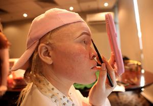 (250702) -- HARARE, 2 julio, 2025 (Xinhua) -- Imagen del 28 de junio de 2025 de una concursante maquillándose previo al concurso inaugural de "Señor y Señorita Albinismo Africa 2025", en Harare, Zimbabue. Organizado por la Iniciativa Atrévete a Soñar con el Albinismo, una organización que implementa diversas actividades para garantizar la protección de los derechos de las personas con albinismo, el certamen coincidió también con el Festival de la Diversidad Africana, cuyo objetivo era celebrar la cultura africana y fomentar el entendimiento entre personas de diversos orígenes. (Xinhua/Shaun Jusa) (jg) (da) (ce)