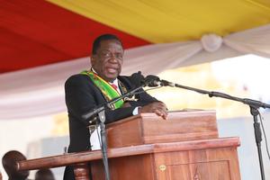 (250811) -- HARARE, 11 agosto, 2025 (Xinhua) -- El presidente de Zimbabue, Emmerson Mnangagwa, pronuncia un discurso en la celebración del 45 Día de los Héroes, en Harare, capital de Zimbabue, el 11 de agosto de 2025. (Xinhua/Shaun Jusa) (oa) (ah) (vf)